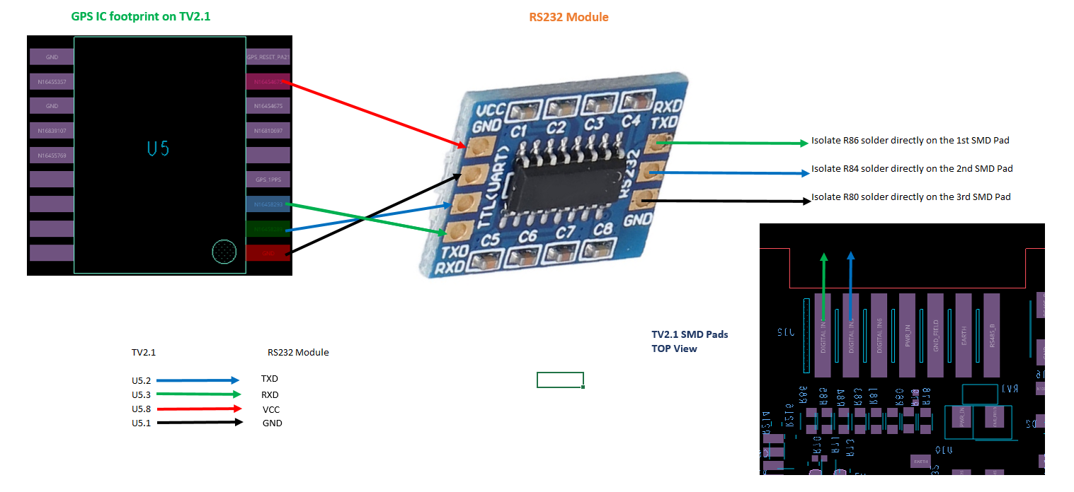 I removed the GPS module from the V2P1 tracker board and placed a UART to RS232 module in the same place, then connected the circuit. I also checked and verified the RS232 to UART connector connection at the external connector.